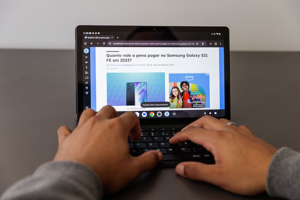 Por falar nessa experiência mais próxima de notebook, gostamos de como as configurações relativamente simples do tablet conseguiram lidar bem com o modo PC. Rodou o Chrome fluidamente, mas alguns aplicativos de redes sociais ficaram mal-adaptados.